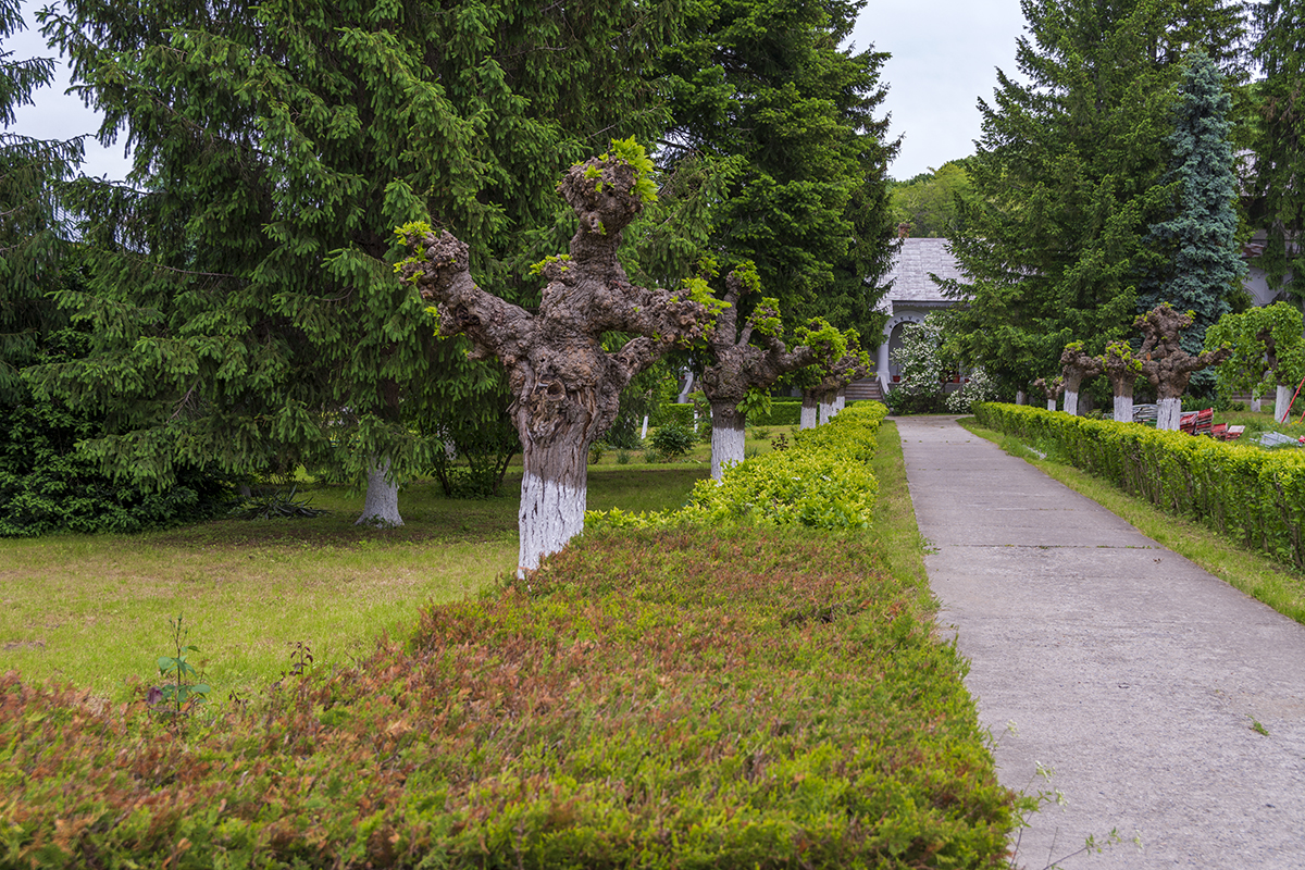 A doua oprire e la Mânăstirea Cocoș. Situată în zona viticolă Niculițel, legenda spune că pe-un deal cocoșul ce-a dat vestirea de dimineață a fost ridicat la rang de nume de Mânăstire. Chilii albe curate și alei îngrijite dau o notă prea perfectă așezământului monahal. E drept că poate mă irită și geamurile termopan și balustrada de inox la intrare. Dar aerul, liniștea și toată vegetația din curte îmi abat gândul de cârcotașă.