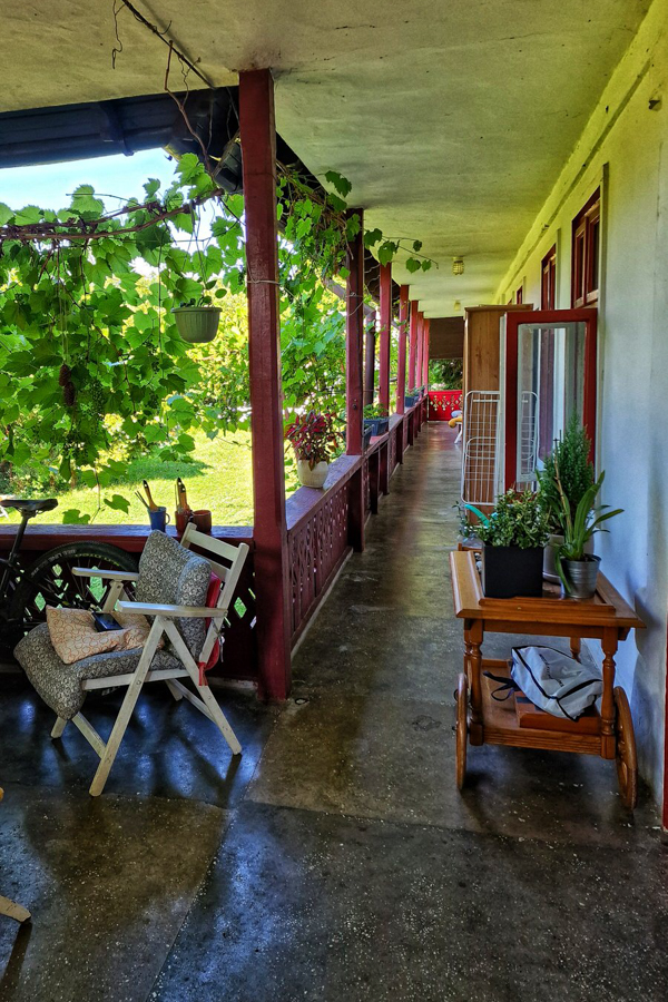 a fost atracția principală pentru mine. Prispa Creatorilor nu e ceea ce se numește confort de 3* sau 4*. Dacă iau în calcul prietenii blănoși, două pisici și trei căței, pentru că nu toată lumea-și dorește atâția ochi ațintiți asupra lor când vine dimineața, poate că aș avea rezerve să recomand. Compensează la greu cu aerul boem, cu acel quelque chose ce-ți aduce aminte de farfuriuța cu dulceață și paharul cu apă. Îți răscolește amintirile păstrate în cufărul memoriei de unde scoți o carte poștală veche, cu miros de lavandă, și un trandafir ce-ți zâmbește discret dimineața.